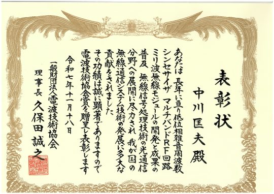 中川匡夫教授の受賞理由は、「無線周波数回路技術と無線信号処理技術の研究開発により無線通信システム技術の発展と展開に貢献」です。