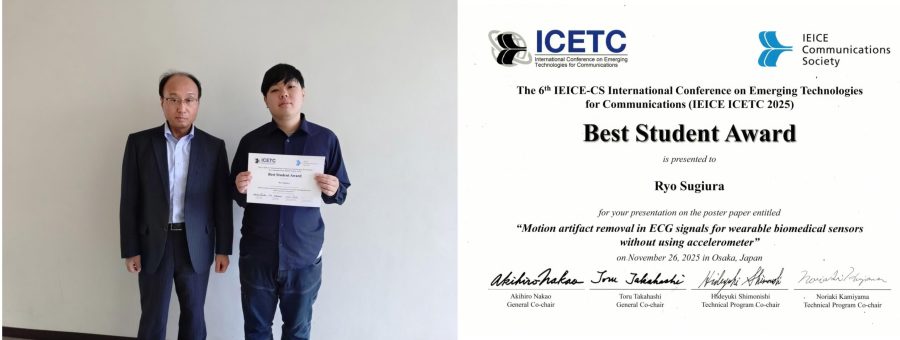 2025年11月26日~28日に大阪で開催された国際会議IEICE ICETC 2025において、持続性社会創生科学研究科 工学専攻 情報エレクトロニクスコース ヒューマン情報工学研究室(中川教授)の博士前期課程2年 杉浦怜旺さんがBest Student Awardを受賞しました。