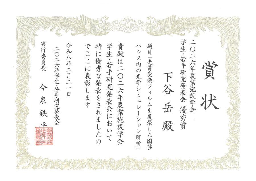 持続性社会創生科学研究科工学専攻情報エレクトロニクスコースの下谷さんが、2026年農業施設学会学生・若手研究発表会で優秀賞を受賞しました。
