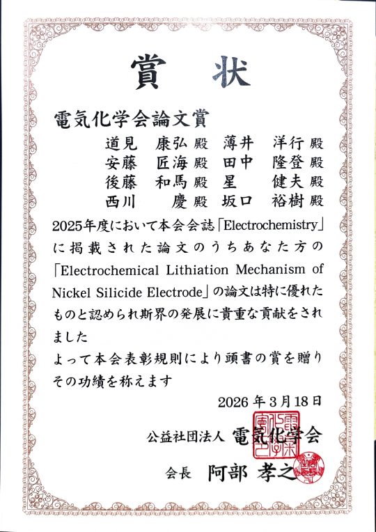 【受賞】道見先生,薄井先生,坂口先生,化学バイオコースの学生が2026年電気化学会論文賞を受賞しました